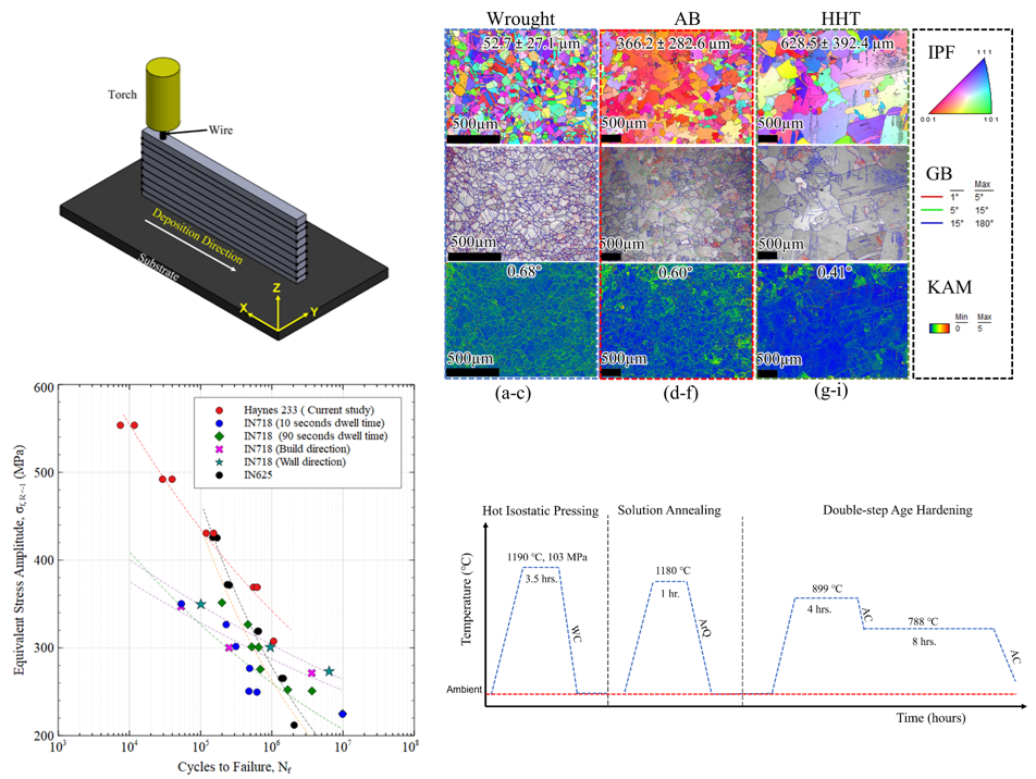 Additive manufacturing (AM) offers advantages for producing large, complex parts, such as reduced material waste, shorter lead times, and a lower buy-to-fly ratio. Wire Arc Additive Manufacturing (WAAM), with its high deposition rate and lower feedstock cost, is particularly suited for industrial applications. Haynes ® 233, a nickel-based superalloy from the Ni-Co-Cr-Mo-Al system, was recently introduced by Haynes International Inc. As a newly developed alloy, data on its mechanical properties is limited. This study investigates the microstructure, tensile, and fatigue properties of heat-treated (HT) WAAM Haynes ® 233 and compares them to its wrought counterpart. Yield strength (YS), ultimate tensile strength (UTS), and fatigue strength of WAAM Haynes ® 233 are 709.4 MPa, 890.1 MPa, and 253.8 MPa, respectively. These values indicate a 63.8 % increase in YS, a 1.11 % decrease in UTS, and a 21.7 % increase in fatigue strength compared to the wrought material. The slight decrease in UTS is attributed to process induced defects, while the improved fatigue strength in the HT material is due to the increased volume fraction and spatial distribution of carbides in the microstructure. Fractography of the tensile fracture surfaces indicated ductile failure in the wrought material and brittle failure in the HT WAAM material, with defects acting as initiation sites for fatigue failure in both materials.