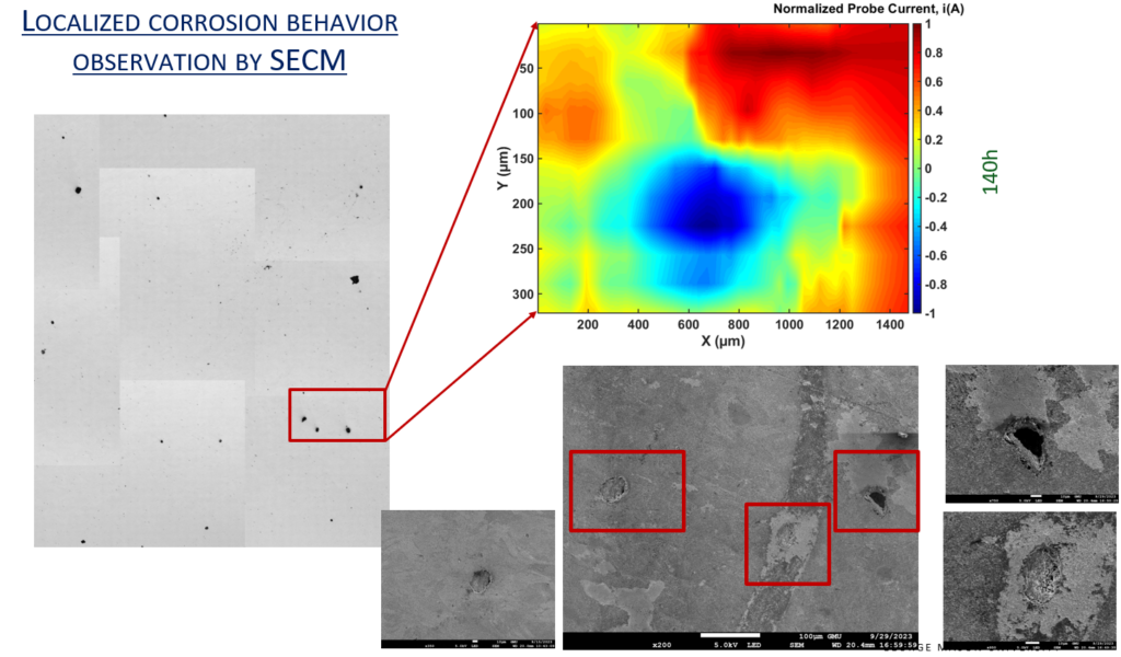 Corroding surfaces react to the electrochemical potential and the chemical composition of the solution in which they are in direct contact. While bulk (macro) electrochemical analysis provides average corrosion response of the exposed surfaces, the local (micro) electrochemical analysis methods provide grain scale corrosion response which is most relevant to materials with heterogeneous microstructural features such as AM metals. The unique microstructural features of AM metals along with complex electrochemical potential and chemical composition of the solution that occur in occluded regions such as pits and cracks have made it difficult to fundamentally understand the corrosion process that locally occurs in these regions especially under mechanical stresses. The overarching goal of this research is to advance our ability to fundamentally understand the synergy between corrosion and mechanical stresses of environmental cracks, relating the local electrochemical processes to microstructural at the crack tip. Localized electrochemical techniques, such as scanning electrochemical microscopy (SECM), provide the spatial resolution required to study localized corrosion events, for example, at defects. The SEM images of defects following 140h of exposure during SECM testing and subsequent etching are presented in figure below. The regions surrounding each defect, which exhibit varying levels of corrosion activity over time, reflected in the temporal changes in the UME tip current. These observations provide compelling evidence that a different corrosion attack predominantly takes place within the defects due to presence of active and passive regions in their vicinity