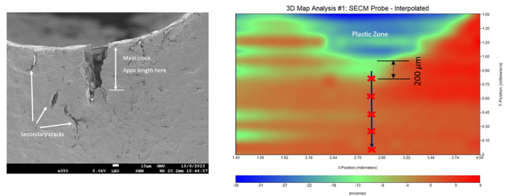 Crack Tip Electrochemical Response in EAC: While macroscale (or bulk) electrochemical techniques, such as cyclic polarization and electrochemical impedance spectroscopy, have been utilized in corrosion for decades, the translation of these techniques into microscale (or local) resolutions is an inherently complex process. In the world of corrosion research, very rarely (if at all) is the corrosion process considered to be a uniform process on a macroscale. For this exact reason, there has been a push to focus on the microscale processes occurring during corrosion. Scanning Electrochemical Microscopy (SECM) is a unique technique for corrosion for detecting diverse reactive species and corrosion products. It includes an Ultra MicroElectrode (UME) probe with 10µm Pt wire. The probe approaches the surface from bulk solution to a close proximity (<5µm) and collects corrosion current. It then generates approaching (or feedback) curves. These curves are either decreasing in current, for an insulative surface, or increasing for a conductive surface. The approaching curves are good indicators of local electrochemical reactivity of the surface. We performed SCEM scan and in feedback mode at the fatigue crack tip. Figure below shows a scan map of a compact tension specimen at fatigue cycles of 50 and at 978 N maximum load. The color bar provides a qualitative representation of the tip current. Notably, the current is lower for the region close to the notch tip despite a higher plastic strain in this region. This discrepancy arises from the out-of-plane deformation in this region and from the fact that the SECM probe is sensitive to the distance from the specimen surface. As a result, the tip current is lower in this region. Given the out-of-plane deformation ahead of the notch tip, an SECM line scan or area scan at constant probe-to-surface distance does not produce useful results. Thus, the approach curve method is adopted for this purpose. In the approach curve method, the position of the probe does not change in the plane parallel to the specimen surface, instead the probe-to-surface distance decreases incrementally, starting from the bulk solution. This method can be used to investigate the kinetics of the reactions occurring at the specimen surface which are not easily measured by bulk electrochemical methods such as Tafel tests.